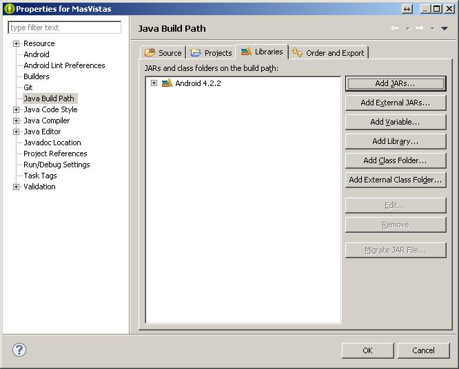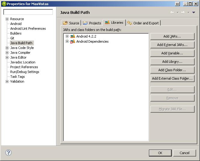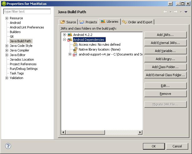Podemos ver claramente un aspa roha en Android Dependencies, aunque el android 4.2.2 que es la version para la que estoy desarrolando la aplicacion esta perfecta, por lo que Android no deberia tener mas dependencias, si la desplegamos veremos que es la libreria de la que nos dice el error que no encuentra